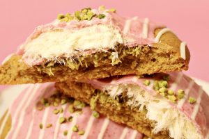 しっとりほろほろ食感のクッキー生地に、注目のピシュマニエ、ローストしたカダイフ、香ばしいピスタチオソースを重ねて焼き上げました🍪💕