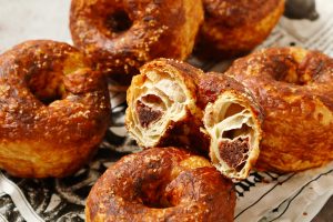 ラウゲン液(重曹水)を使った焼き上げによる独特の焦げ茶色の焼き色やツヤ、深みのある芳ばしさを活かしながら、クロワッサンやデニッシュ生地の甘みや食感と掛け合わせることで、これまでにない美味しさを実現しました。