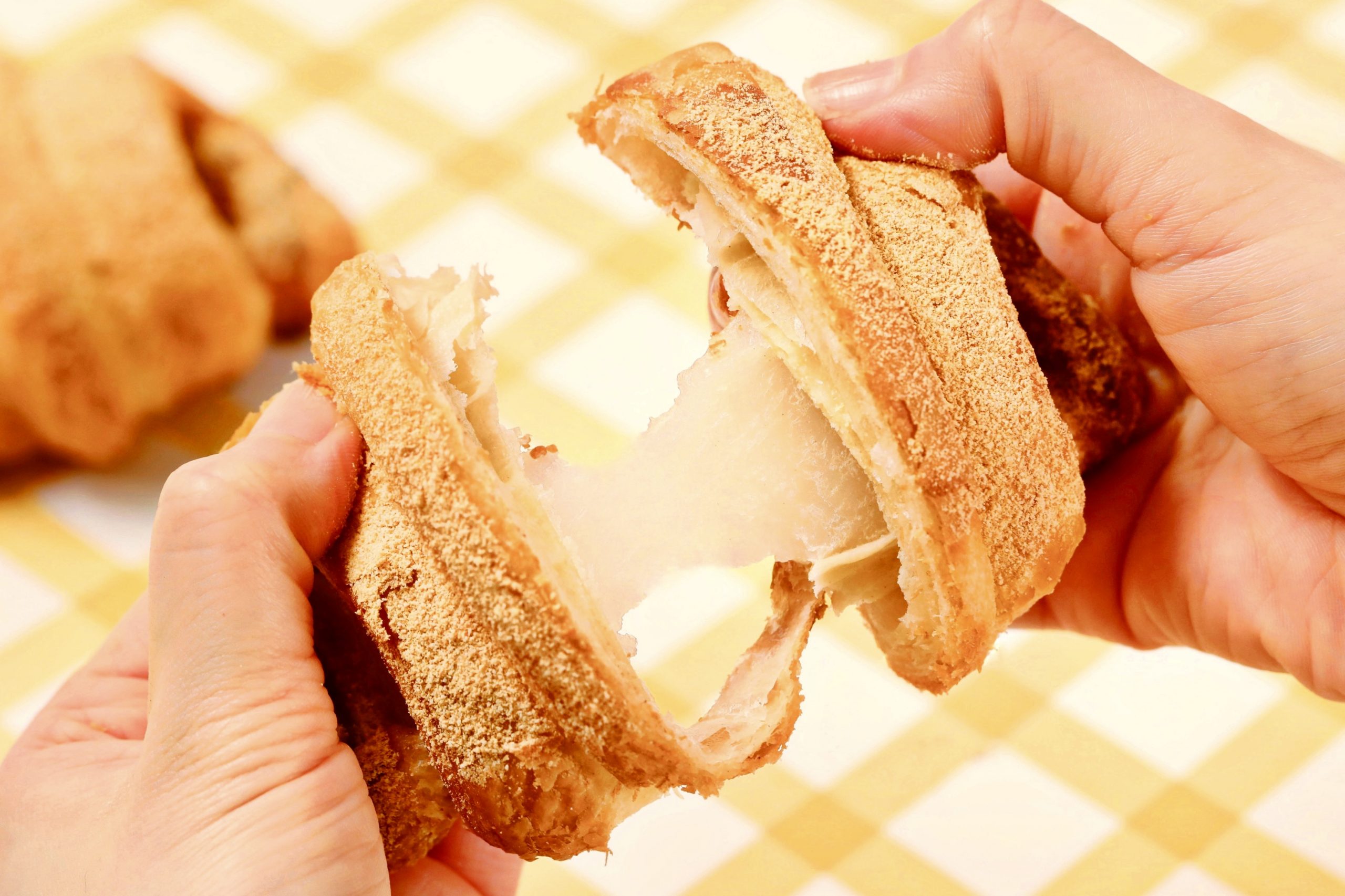 クロワッサンのサクサク食感と、もちもちとした餅の弾力を同時に楽しめる『クロッチ』に、香ばしいきなこの味わいをプラスしました。
